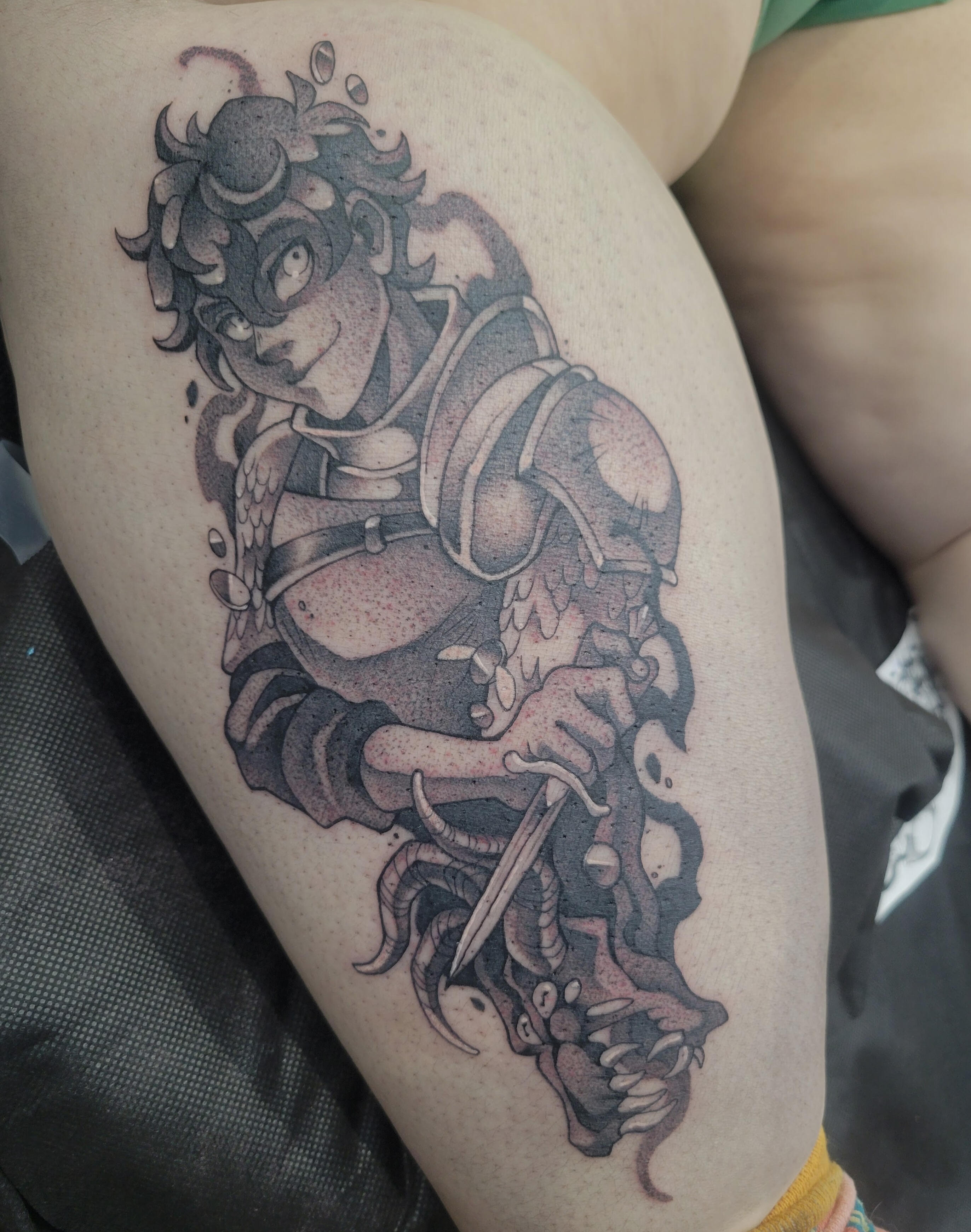 This panel of Falin from Dungeon Meshi (would need to be min. 12" -an entire calf, shin, shoulder, or thigh) (CH. 97 SPOILER)